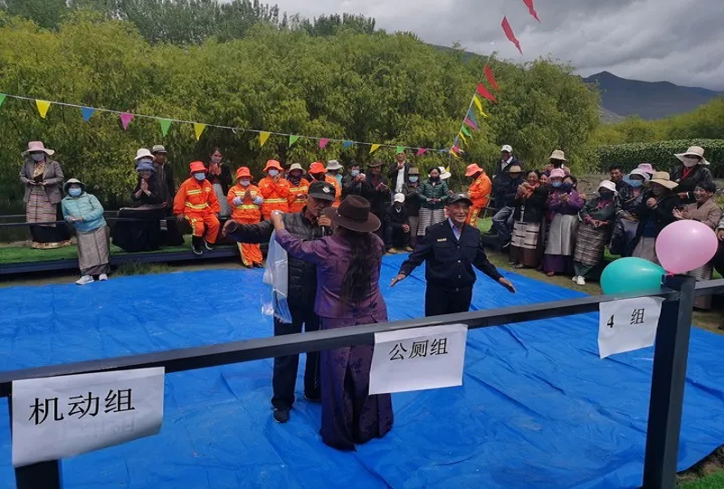 熱情洋溢的歌舞、考驗(yàn)團(tuán)結(jié)的拔河比賽、充滿濃烈民族色彩的抱石頭、翻桶比賽......平時樸素的環(huán)衛(wèi)工作者們紛紛脫下了沉悶的工作服,穿上了華美的藏袍,伴隨著精彩的活動,大家或是跳舞唱歌,嘻嘻鬧鬧;或是三五成群,談笑風(fēng)生,整場活動高潮迭起、笑聲不斷。
